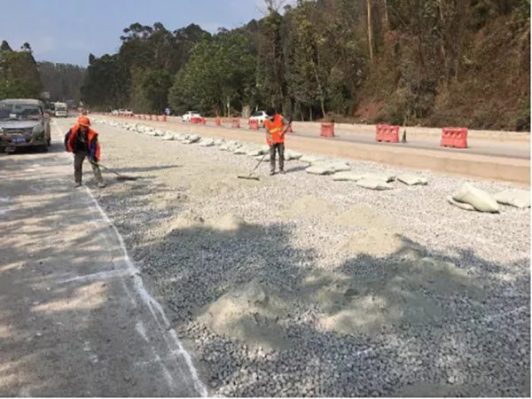 在原水泥穩(wěn)定碎石基層上面添加10%的碎石,使用平地機和人工配合進行均勻撒布。