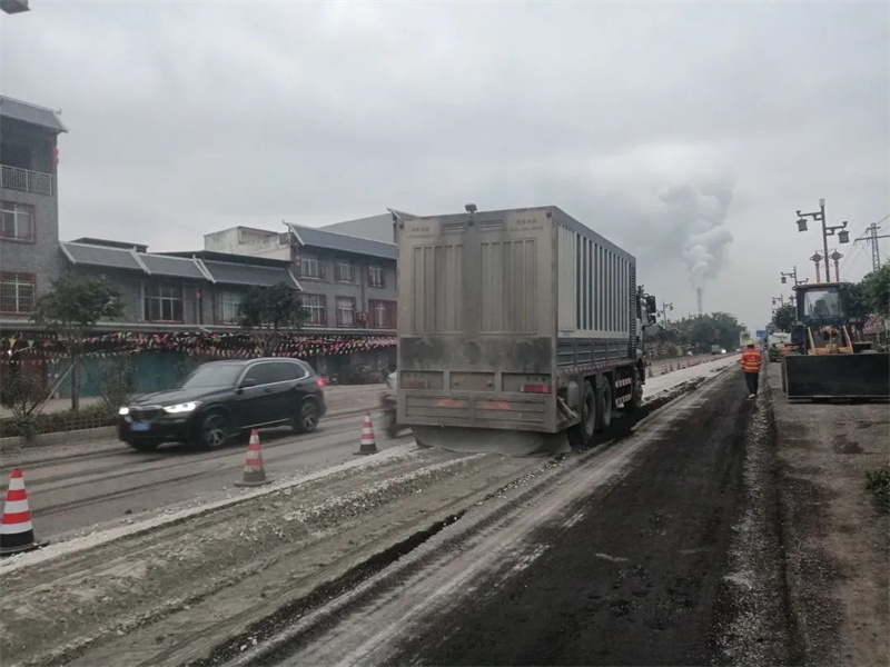 2.然后使用集料撒布機(jī)將新加的碎石和石屑(已按 1:1 比例預(yù)先混配好)均勻撒布于銑刨料之上;