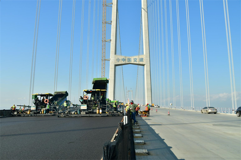 福格勒攤鋪機(jī)雙機(jī)并鋪在伶仃洋大橋鋼橋面進(jìn)行鋪裝作業(yè)場(chǎng)景